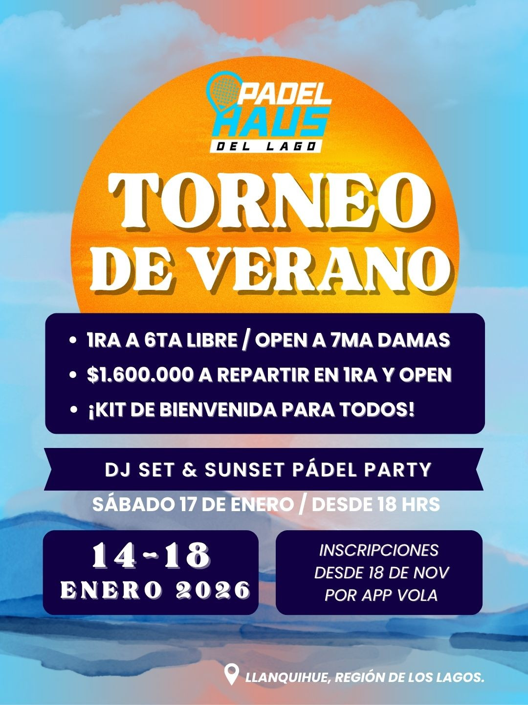 Club de Padel con una hermosa vista al Lago Llanquihue. Contamos con tres canchas, tienda deportiva, un patio con juegos para niños y parrilla disponible para los clientes. El servicio de comida está a cargo de una exquisita sanguchería abierta en los torneos, para eventos a petición y en temporada de primavera y verano.